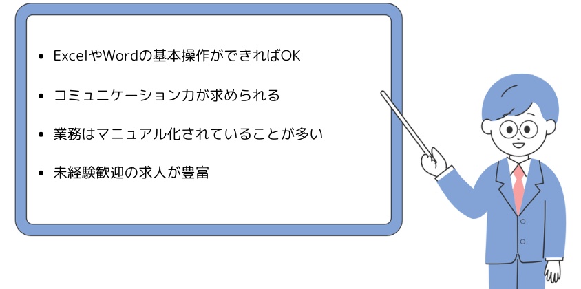 特に、一般事務や営業事務は、基本的なパソコン操作さえできれば、特別な資格がなくても始められます。